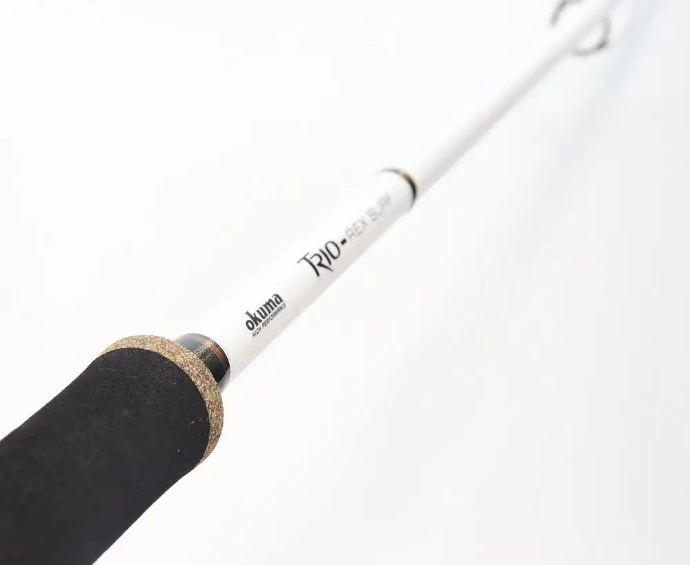 Light weight and long casting, the Okuma Trio Rex Surf is available in a 12′ 2 piece and 13′ 3 piece for easy transport and storage, with a big cast weight of 85 to 170g (3-6oz). Features include tangle free stainless steel guides, high modulus graphite construction, Fuji reel seat and comfortable EVA grips. Ideal for spinning lures or casting baits, with a line rating of 20-30lb.