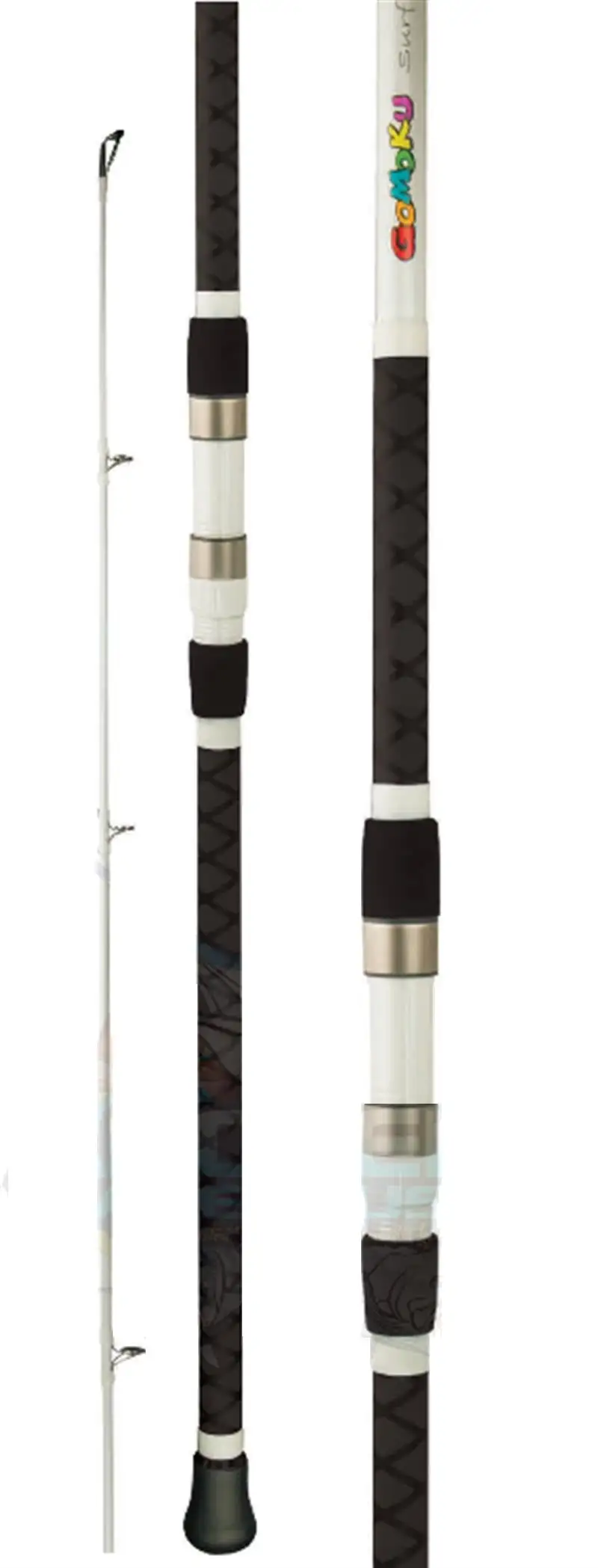 Light and powerful, the new Gomoku surf rods have soft tips for casting distance and accuracy but plenty of power in the lower end to be able to stop even the biggest Mulloway or Australian Salmon. Featuring Hi-Modulus graphite blanks, colour coded shrink wrap grips, they are all fitted with Fuji KR Stripper Guides, Fuji O Guides and Fuji Reel seats. They are available in three lengths of 9ft 2 piece medium heavy, 12′ 2 piece medium and 13ft 3 piece heavy. Suitable line breaking strains range from 8kg up to 15kg on the heaviest model. Lure casting weights start at 30 gm and end at 150gm.