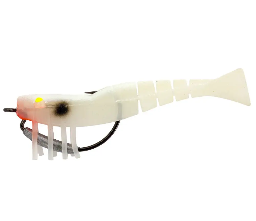 The Live Shrimp can be rigged on the supplied weedless worm hook or on a conventional jig head for open area fishing and the lumo eyes and segmented tail provide even further attraction while this lure is being used.
